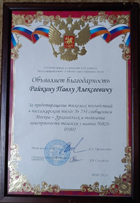 Несколько лет назад мой папа предотвратил крушение пассажирского состава, вовремя выявил неисправность. За это был награжден почетной грамотой и именными часами от руководства железной дороги. Сегодня у папы седьмой разряд - самый высший для осмотрщика! По любому вопросу, связанному с работой, он всегда даст обстоятельный ответ. Он сам уже давно наставник для десятков молодых специалистов. Я очень горжусь своим папой и хочу быть таким же грамотным и ответственным, настоящим профессионалом и знатоком своего дела, как он.