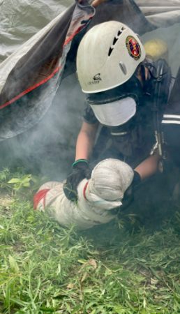 Этапы которые были на дистанции: путевой трос, преодоление оврага/обвала, спасение пострадавшего в задымленном «помещении, смотка пожарных рукавов, перенос огнетушителя, прохождение веревочного лаза с пострадавшим, тащили резину на расстоянии