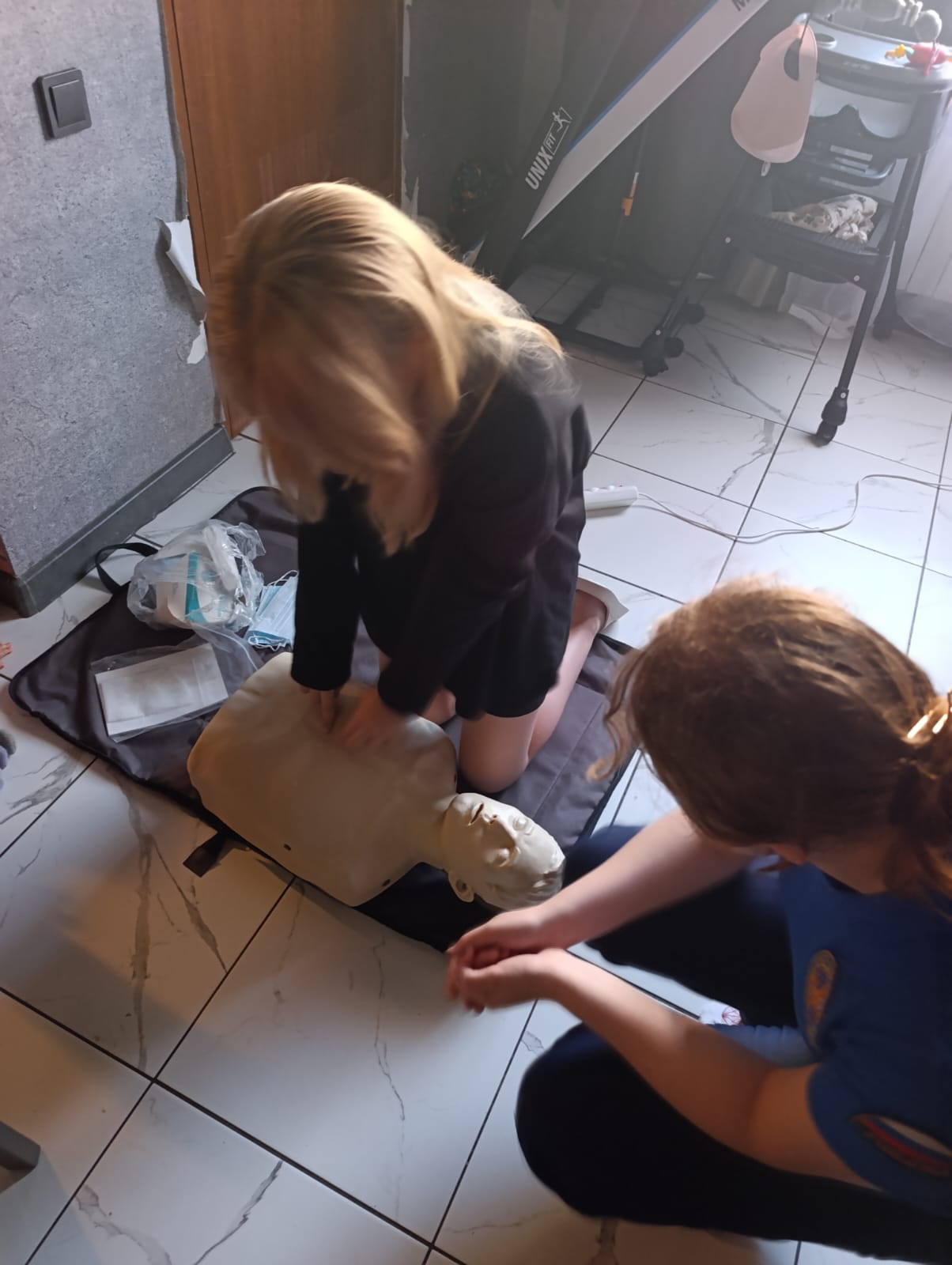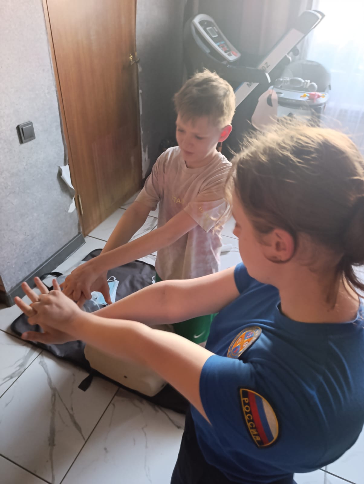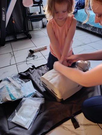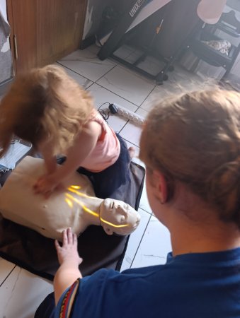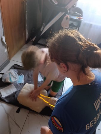 После инструктажа каждый захотел попробовать "оказать первую помощь". Тренировались в приемах сердечно-легочной реанимации. Очень радовались, когда все получалось и включался индикатор, указывающий на положительный результат.А вот навыки отработки освобождения дыхательных путей (прием Геймлиха) отрабатывали друг на друге, поочередно надевая тренажер.