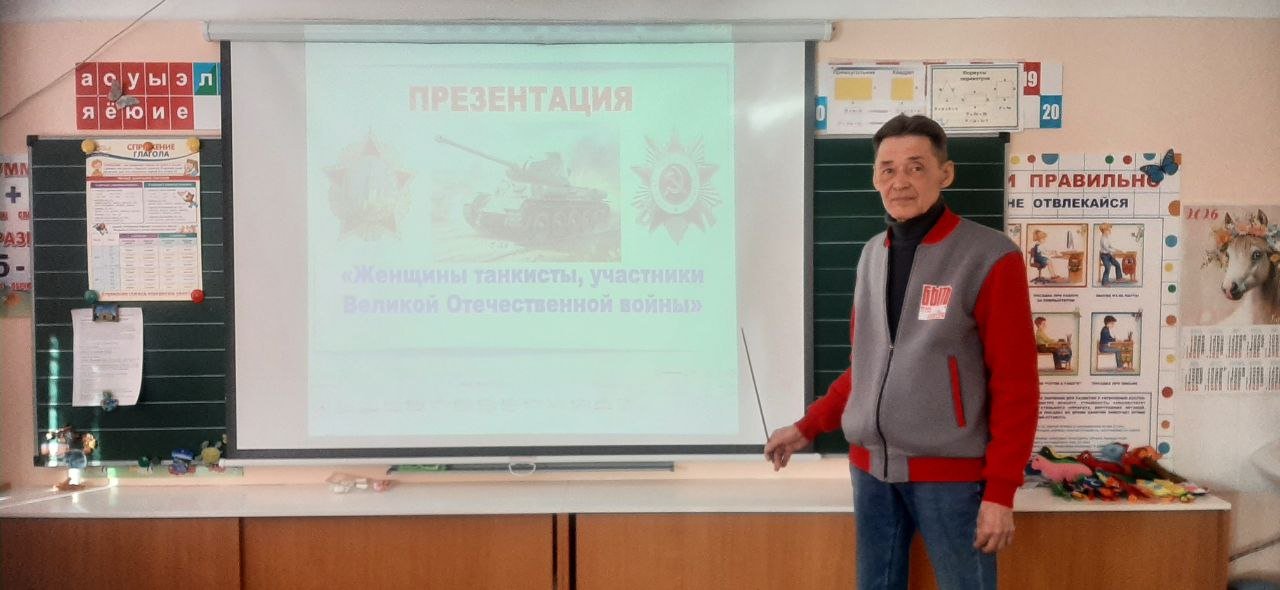 Александр Голубев презентовал познавательный буклеты «Женщины танкисты, участники Великой отечественной войны» и рассказал учащимся из дружины – младшая группа (4а класса) о героических подвигах женщинах танкистах, о тех кто в годы Великой Отечественной войны сел за рычаги танков, а так же о истории создания «Бронетанковых войск» и праздника «День танкиста».