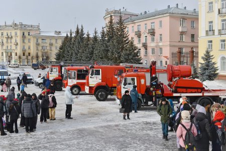 После конкурса дети поехали на центральную городскую площадь Ленина, где перед зданием Дворца культуры, в честь Дня защитника Отечества состоялась выставка служебного транспорта: ФГКУ «Специальное управление ФПС № 2 МЧС России», МВД, Росгвардии и войсковых частей города.